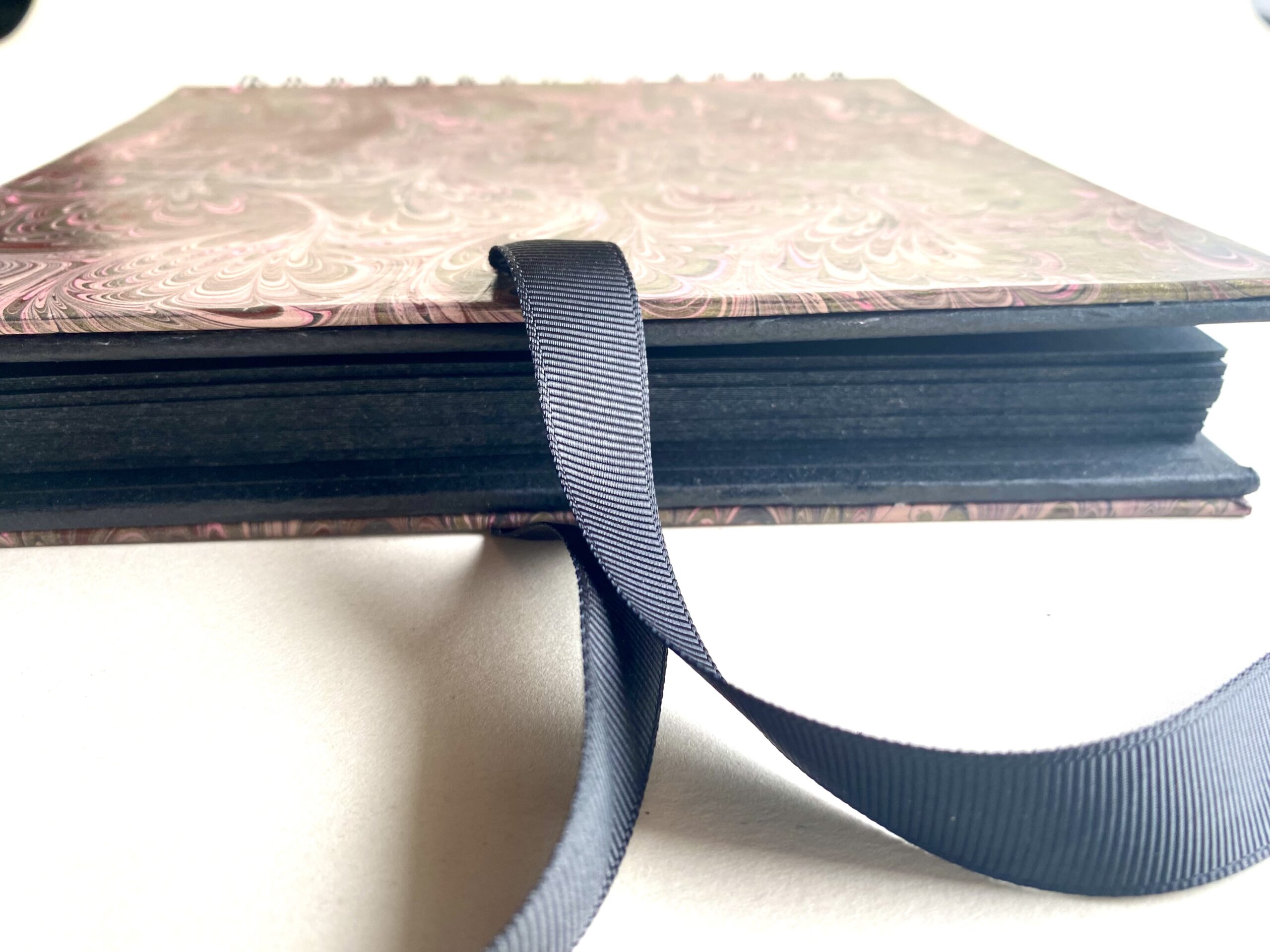 Album zdobiony ręcznie w technice ebru, jedyny w swoim rodzaju. Twarda okładka, zabezpieczona werniksem, wykończenie błyszczące, w środku kartki czarne ze sztywnej tektury, wiązany z boku na wstążeczkę. Wymiary 20,5x 20,5 cm.